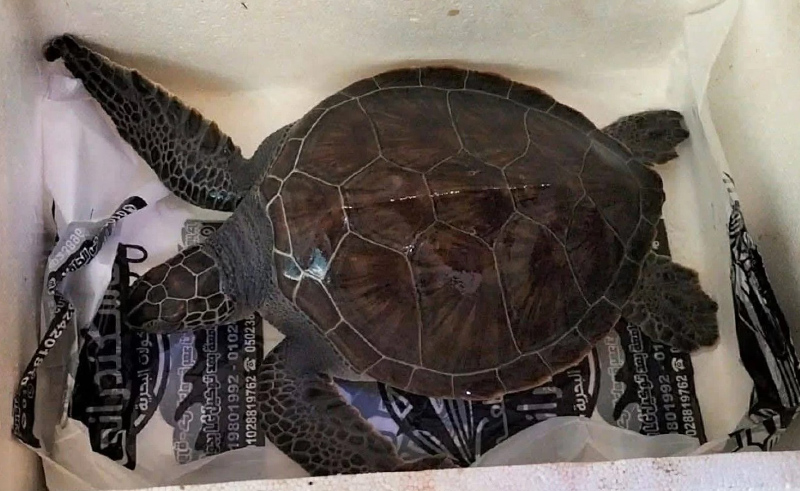 وأضاف الجهاز، إن السلحفاة البحرية الخضراء من الكائنات المهددة بالانقراض عالميًا والمشمولة بالحماية القانونية، والجهاز أول لما استقبل البلاغ من أحد المواطنين، انتقلت الحملة للمكان فورًا.